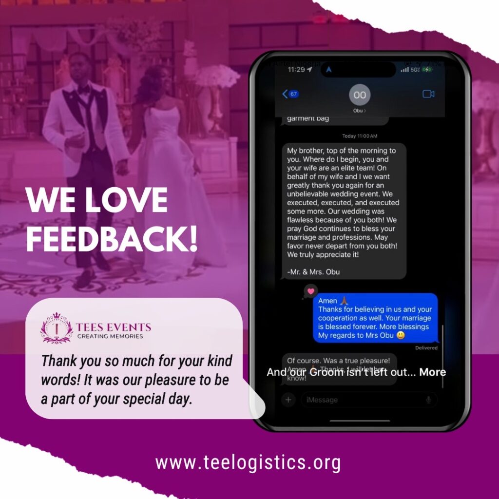 With the best customer service and professional touch I give it to Tees Events & Logistics for my stress free event